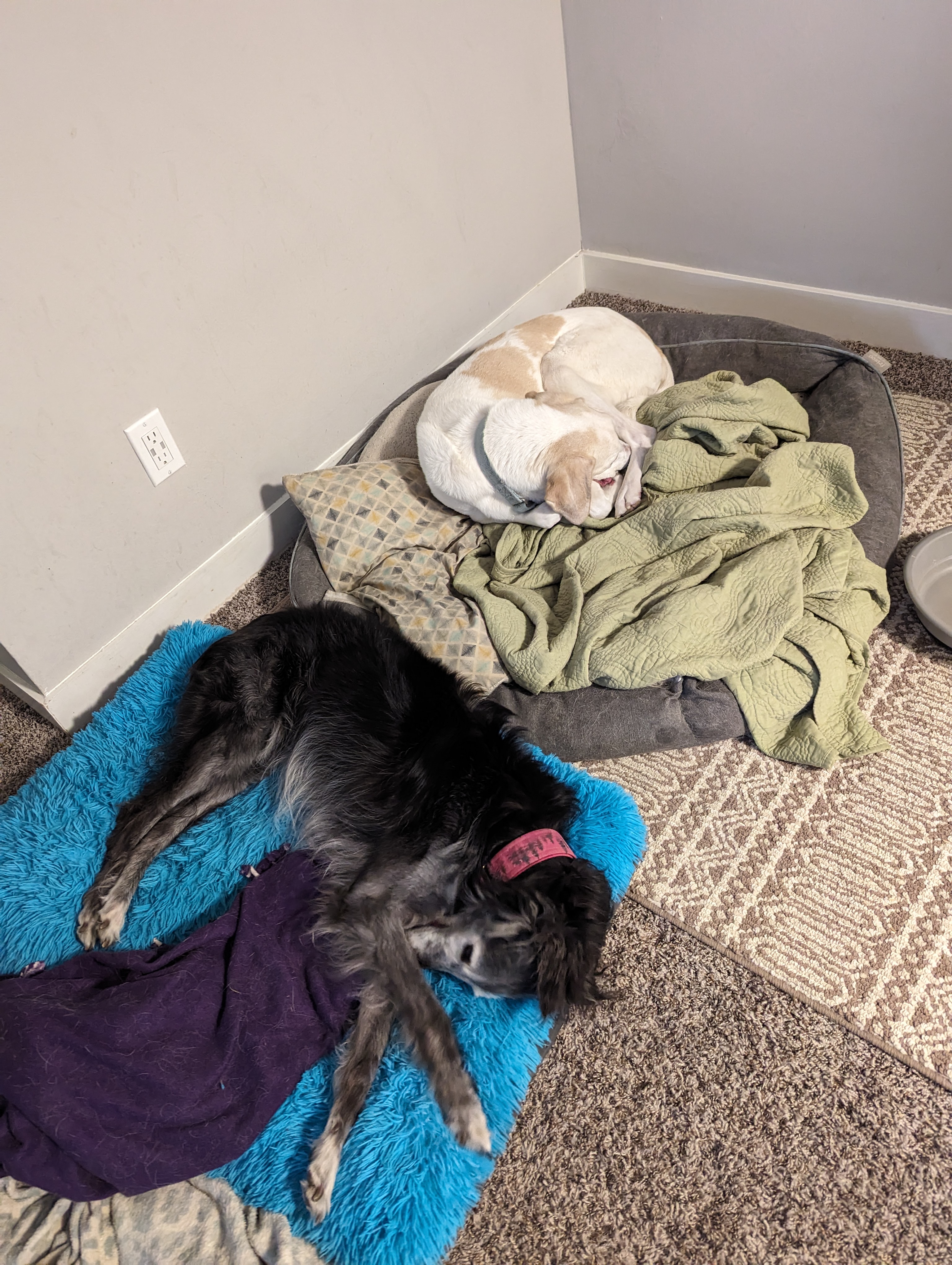 - a black and white silken windhound laying on a cookie monster blue bed, his nose tucked between his front legs