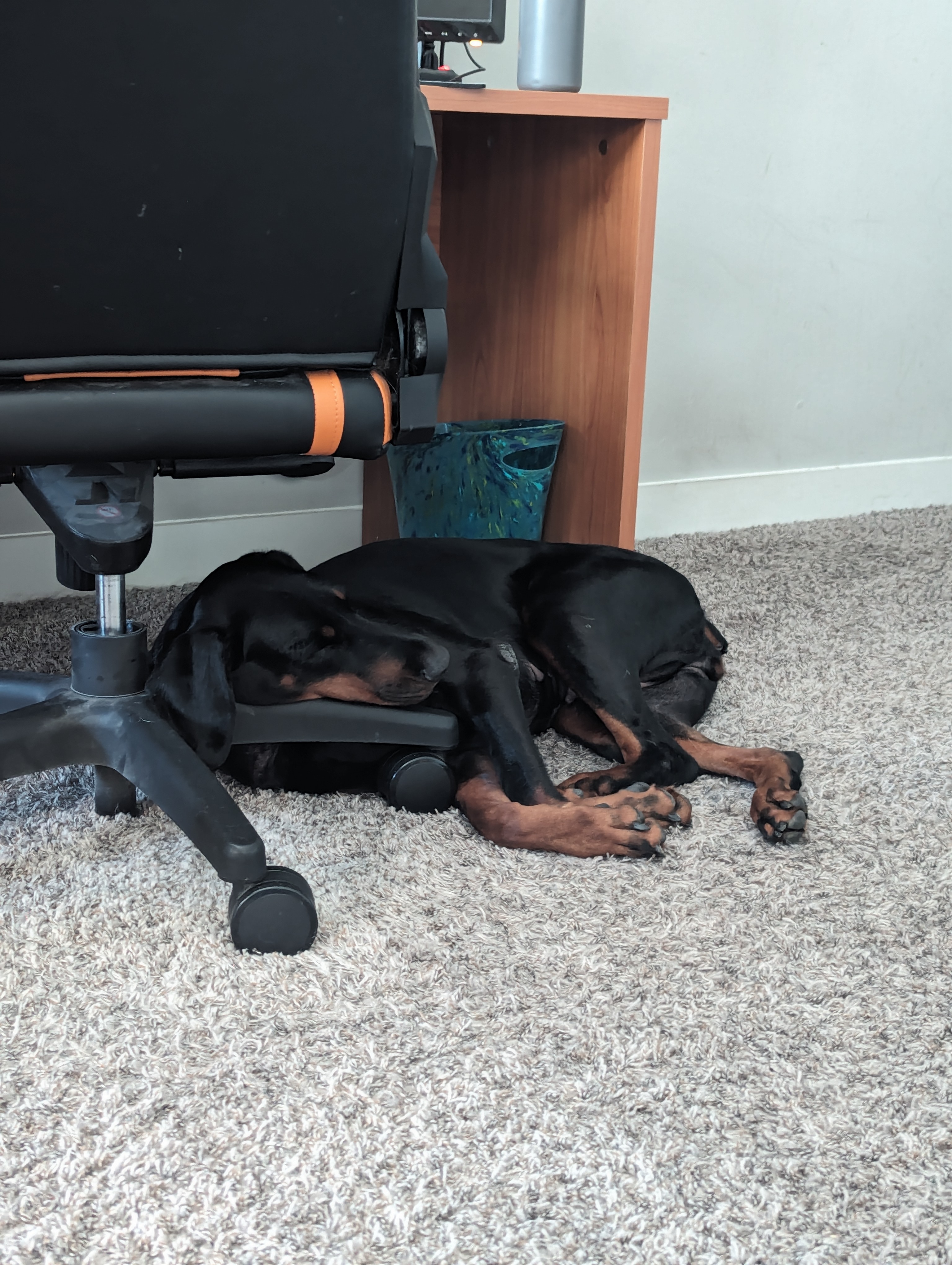 - a doberman curled up in the legs of an office/gaming chair, using one chair leg as a pillow