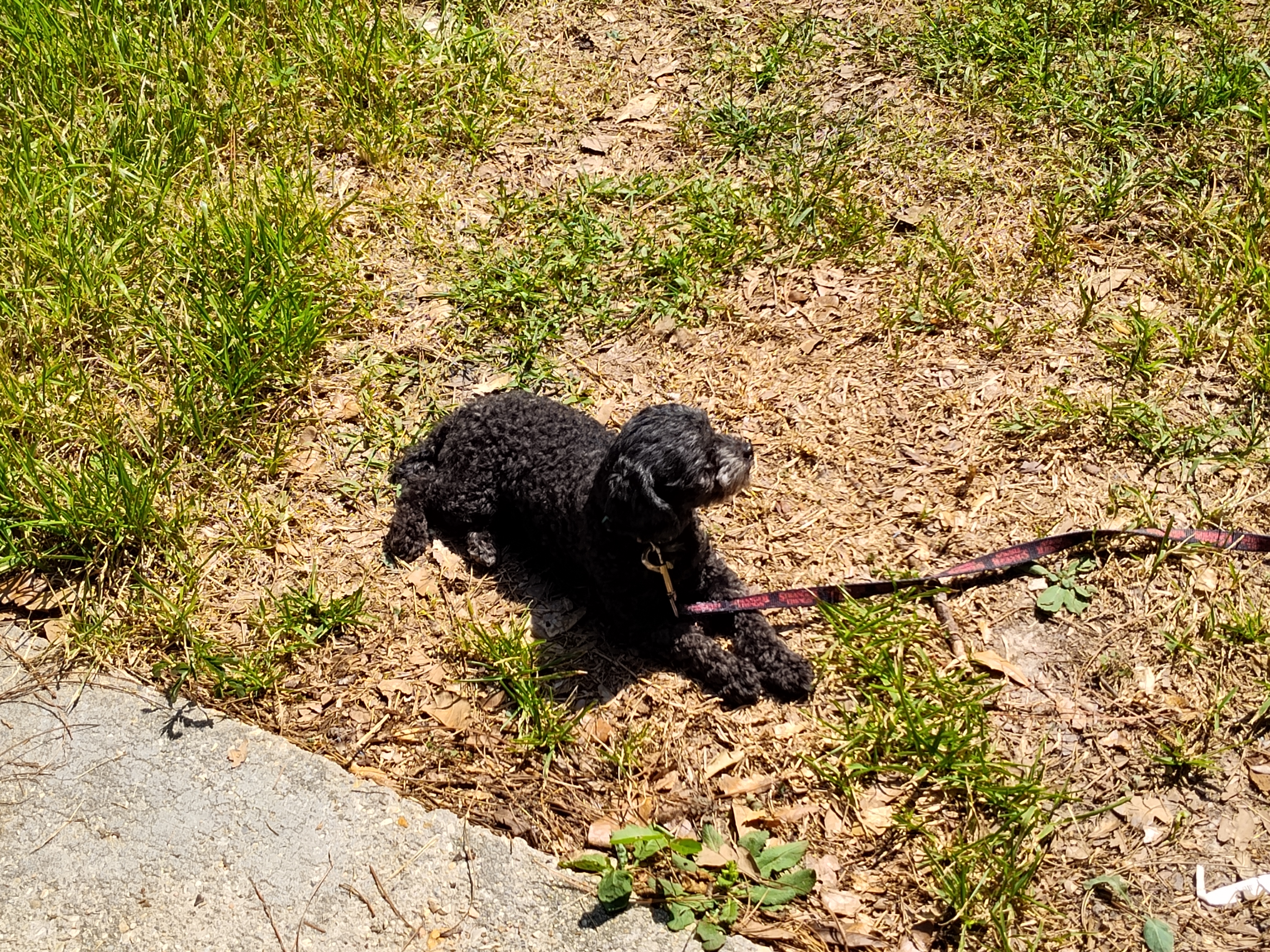 Small black dog laying in the sun